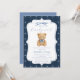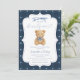 Edit all the text to personalize this teddy bear design invitation. Features a sweet teddy bear with a blue bow, navy blue background with hearts, and a ribbon blue bow. All the text is editable. Perfect for many occasions.