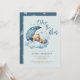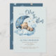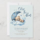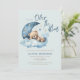 Nous sommes au-dessus de la lune Invitation Baby shower avec un ours en peluche mignon dormant sur le nuage bleu bouffant et la lune et les étoiles à moitié croissant. Baby shower garçon doux invitation.