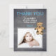 Carte de remerciements d'anniversaire moderne pour remercier vos invités avec un ours en peluche mignon. Carte de remerciements simple pour les enfants - fille et garçon, surtout pour 1er et 2e anniversaire. Personnalisez la carte avec votre photo et votre nom. Vous pouvez également modifier le texte de remerciement et écrire les vôtres. Le texte est dans des couleurs modernes, modernes, blanches et bleues. L'arrière - plan est le tableau noir gris.