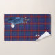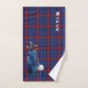 Tartan plaid serviette de golf fait dans le clan écossais bleu et rouge Glenn tartan motif. Graphiques d'un sac de golf bleu avec clubs et balle de golf, décorent un coin et texte blanc personnalisé décorent le coin opposé. Personnalisez le nom pour vous-même ou comme une excellente idée cadeau à votre golfeur préféré.