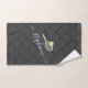Serviette de cuisine design de tennis personnalisée gris avec un monogramme, nom, ou texte personnalisé dispose d'une police de calligraphie simple, moderne et élégante avec une raquette de tennis et une icône de balle de tennis et un arrière - plan de filet passé.