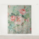 Reproduction d'Art Fin de Tissu Vintage Britannique 1890 avec des roses roses et des marguerites de gerbera sur un fond vert clair avec un ruban bleu.