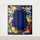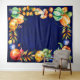 Accessoire de toile de fond pour photo ou arrière-plan de photo. De jolies citrouilles aquarelles élégantes, feuilles, raisins, fruits et noix forment un cadre. Utiliser pour Thanksgiving, Friendsgiving, Fête de la récolte, Trunk of Treat ou soirées d'Halloween. Demandez à vos invités de se tenir debout devant cet arrière-plan de récolte automnale et utilisez-le pour prendre des photos selfie ou des photos de groupe. Fond bleu foncé.