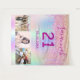 Pour une fête d'anniversaire de 21 ans. Un collage de 3 de vos photos d'elle, d'amis, de famille, d'intérêts ou d'animaux de compagnie. Un fond de couleur holographique arc-en-ciel en violet, rose, or rose et vert menthe. Décoré de gouttes de paillettes fausses. Personnalisez et ajoutez son nom, âge 21 ans et une date. Date de naissance ou date de la fête d'anniversaire. Texte de couleur violette. Parfait pour une fête surprise ! Utilisez comme bannière de bienvenue, décoration murale ou comme toile de fond pour photomaton.