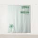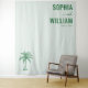 Ce décor de mariage présente un design minimaliste avec un fond vert menthe doux, créant une atmosphère élégante et sereine. La disposition comprend une typographie serif gras en vert forêt profond pour les noms "SOPHIA" et "WILLIAM", accompagnés d'une date en dessous, le tout centré en haut. Une illustration détaillée de palmier ajoute une touche tropicale subtile au coin inférieur gauche. La composition épurée et l'esthétique moderne la rendent parfaite pour les mariages contemporains, mêlant formalité et charme décontracté.