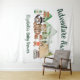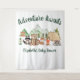 Belle tapisserie de baby shower rustique signe d'accueil et fond photo avec une aquarelle illustrant les animaux des bois avec leur tente et feu de camp campant dans les montagnes et la forêt et "Adventure Awaits" et le nom de la future mère dans un script vert de chasseur foncé.