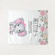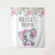 Tapisserie de baby shower avec une illustration aquarelle d'un éléphant rose mignon. Elle a des oreilles à pois rose et blanc et un joli nœud ruban rose sur le dessus de sa tête.