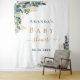 Un fond blanc chic. Décoré de feuilles d'eucalyptus aquarellées vertes, de brindilles, de verdure et de feuilles dorées fausses. Personnalisez et ajoutez le nom de la future maman et une date. Lettres noires et dorées. Peut être utilisé comme bannière de bienvenue pour une baby shower, comme décoration murale de fête ou comme toile de fond pour photobooth.