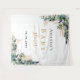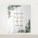 Un fond blanc chic. Décoré de feuilles d'eucalyptus aquarellées vertes, de brindilles, de verdure et de feuilles dorées fausses. Personnalisez et ajoutez le nom de la future maman et une date. Lettres noires et dorées. Peut être utilisé comme bannière de bienvenue pour une baby shower, comme décoration murale de fête ou comme toile de fond pour photobooth.