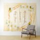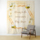 Elegante et amusante tapisserie pour baby shower d'été. Fond jaune et blanc avec un motif de nid d'abeille. Avec un cadre géométrique en faux or. Décorée de fleurs tropicales jaune clair et crème, d'hibiscus et de joyeuses abeilles. Avec le texte : Maman abeille et le nom de la future maman. Modèle pour le nom et une date. Peut être utilisée comme décoration murale pour le baby shower ou comme toile de fond pour les photos.