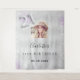 Une tapisserie de bienvenue pour une fête de 21e anniversaire girly et glamour. Un fond métallisé argenté faux décoré de poussière de paillettes violettes et argentées. Personnalisez et ajoutez une photo de haute qualité, un nom et une date. Le numéro 21 est écrit avec une police de caractères de style ballon. Peut également être utilisé comme toile de fond pour photomaton et décoration murale de fête.