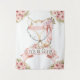 Toile de fond pour baby shower renard avec un adorable bébé renard fille avec un joli nœud rose sur un fond floral aquarelle rose et or. Cette grande toile de fond de table pour baby shower bohème renard est facilement personnalisable avec le texte de votre choix.