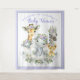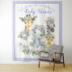 Toile de fond pour baby shower safari fille avec des animaux bébé fille adorables avec des fleurs violettes sur un fond de verdure et de violet. Cette bannière de baby shower safari est facilement personnalisable pour votre événement en ajoutant simplement votre texte.
