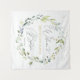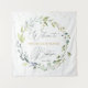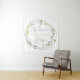 Tapisserie de baptême/baptême de bébé. Ce design présente une illustration de feuillage vert et de feuilles d'eucalyptus dans un style aquarelle. Au-dessus des feuilles, des confettis ornent le haut de la tapisserie (leurs images peuvent être supprimées). Au sommet de la couronne, il y a une image d'une Croix.