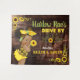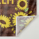 Bébé afro-américaine avec des nattes à queue de cheval adorables portant une couche à fronces jaune et un bodysum brun ; tenant un tournesol jaune vif, sur un fond en bois brun foncé rustique. Idéal pour les fêtes prénatales ou les anniversaires sur le thème du tournesol ou du jardin ©2021 Miss Sassy