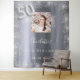 Une tapisserie de bienvenue pour une fête glamour de 50e anniversaire. Un fond métallisé argenté faux décoré de fausse poussière de paillettes. Personnalisez et ajoutez une photo de haute qualité, un nom et une date. Le numéro 50 est écrit avec une police de caractères de style ballon.