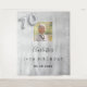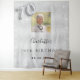 Une tapisserie de bienvenue pour une fête de 70 ans glamour. Un fond métallisé argenté faux décoré de fausses paillettes. Personnalisez et ajoutez une photo de haute qualité, un nom et une date. Le numéro 70 est écrit avec une police de caractères de style ballon.