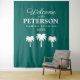 Bienvenue sur le fond pour photos de la fête de réunion de famille. Modèle de typographie élégant pour le nom de famille et la date. Couleurs de fond sarcelle ou personnalisées. Idéal pour réaliser de superbes photos de groupe et selfies professionnels. Tapisserie décorative murale personnalisée disponible en petites et grandes tailles extra larges. Décoration personnalisée pour une réunion de famille amusante, une rencontre, une célébration, etc. Silhouettes de palmiers tropicaux avec une typographie élégante. Téléchargez votre propre logo ou blason chic en option.