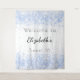 Une tapisserie de bienvenue pour une fête d'anniversaire 16 ans, girly et glamour. Un fond métallisé argenté faux orné de gouttes de paillettes bleues fausses. Personnalisez et ajoutez un nom et un âge. Lettres noires.
