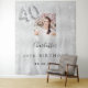 Une tapisserie de bienvenue pour une fête glamour de 40e anniversaire. Un fond métallisé argenté faux décoré de fausse poussière de paillettes. Personnalisez et ajoutez une photo de haute qualité, un nom et une date. Le numéro 40 est écrit avec une police de caractères de style ballon.