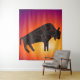 Animaux préhistoriques Fiery Bison ou Taureau suspendu. Animaux anciens inspirés des pétroglyphes dans le monde entier. Une oeuvre d'art antique d'un animal dans son environnement. Cela ressemble à un animal de taureau ou de bison des anciens dessins de grottes. Arrière - plan de coucher de soleil coloré avec bison de lave flamboyante. Inspiré par les pétroglyphes.