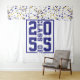 Créez des souvenirs durables avec un appareil photo et votre tapisserie de typographie sportive Classe de ____ ! Fond blanc, typographie bleue, année personnalisable et en-tête de confettis faux bleu et or en haut.