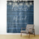 Doté de jolies lampes à cordes et d'un script de signature typographique chic sur un arrière - plan de panneaux de bois bleu, ce stand photo mariage rustique peut être personnalisé avec vos noms et date spéciale. Conçu par Thisisnotme©