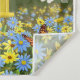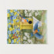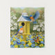 Une paire de bleuets de l'est font leur maison dans une mignonne maison d'oiseaux jaunes dans un beau jardin de printemps rempli de marguerites bleues et jaunes et entouré de bois de chien en fleurs. Des papillons orange et bleus viennent également visiter les fleurs. Oeuvre originale créée par l'artiste faunique Crista S. Forest.