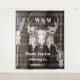 Un décor photo de mariage boho ou jardin de campagne magnifique et rustique avec les bois d'un cerf orné de belles roses roses, plumes pendantes et verdure feuillue sur fond de bois brun.Il est encadré à gauche et à droite par des branches qui ont des plumes de pintade et des fleurs d'été dans des couleurs pâles. Les modèles blancs pour le monogramme des couples nuptiaux et les souhaits à leurs invités apparaissent au-dessus et en dessous du crâne, tout comme un modèle pour la date du mariage.