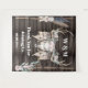 Un magnifique décor de fond pour une photo de mariage champêtre bohème ou campagne, orné des bois d'un cerf embellis de belles roses roses, de plumes tombantes et de feuillage vert foncé sur un fond en bois marron. Il est encadré à gauche et à droite par des branches qui portent des plumes de pintade et des fleurs d'été dans des couleurs fanées et atténuées. Des modèles blancs pour le monogramme du couple et les vœux à leurs invités apparaissent au-dessus et en dessous du crâne, ainsi qu'un modèle pour la date du mariage.
