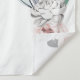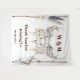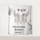 Un magnifique décor de fond pour photo de mariage champêtre ou bohème, avec des bois de cerf ornés de belles roses roses, de plumes tombantes et de feuillage vert, sur un fond blanc. Il est encadré à gauche et à droite par des branches qui portent des plumes de pintade et des fleurs d'été dans des couleurs fanées et atténuées. Des modèles de texte marron pour le monogramme du couple et les souhaits aux invités apparaissent au-dessus et en dessous du crâne, ainsi qu'un modèle pour la date du mariage.