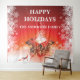 Apportez l'esprit de Noël chez vous ou au bureau avec cette belle bannière rouge, blanche et dorée fausse présentant une jolie boîte à cadeaux rouge qui a été ouverte et d'où s'échappent des étincelles blanches du haut. La boîte porte le mot "Joie" écrit en couleur dorée mat et repose sur une surface blanche brillante au-dessus de laquelle se trouve un fond rouge avec de grands modèles blancs pour votre carte de vœux de Noël de votre famille ou de votre entreprise. Chaque côté du fond est rempli de délicats flocons de neige blancs. Ce design élégant et festif est parfait pour la période des fêtes.