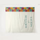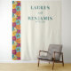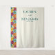 Ce décor de mariage présente un motif floral vibrant à gauche, avec des fleurs stylisées de rouges profonds, d'orangés vifs, de jaunes et de bleus créant une bordure animée. Le côté droit est propre et blanc, offrant un contraste parfait pour la typographie élégante serif qui affiche des noms et une date personnalisables en sarcelle foncée. Le design allie minimalisme contemporain et éléments romantiques, ce qui en fait l'idéal pour célébrer votre jour spécial avec joie et sophistication.