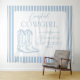tapisserie personnalisée pour enterrement de vie de jeune fille sur le thème de la cowgirl côtière en bleu clair et blanc avec des bottes de cowboy, parfaite comme toile de fond pour photos de fête de bachelorette. Personnalisée avec votre nom et la devise "dernier rodéo". Célébrez votre douche nuptiale avec style avec le thème parfait de fête western country, le thème idéal pour l'amoureuse des chevaux, la mariée cowgirl au thème vintage de Far West et ses demoiselles d'honneur.