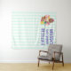 Fond de tapisserie pour une baby shower ou un autre événement. Illustré avec un bol de glace avec 3 boules délicieuses recouvertes de paillettes de bonbons. Un cône de glace avec également 3 boules de chocolat, vanille et fraise. Un bol de dessert rempli de glace parfumée napolitaine avec une cerise délicieuse sur le dessus. Un motif rayé vert et blanc en arrière-plan.