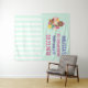 Tapisserie retour pour un baby shower ou un autre événement. Illustré avec un bol de crème glacée avec 3 succulentes boules couvertes de bonbons saupoudrés. Un cône glacé également avec 3 boulettes de chocolat, vanille et fraise. Un bol de desserts rempli de crème glacée au goût néopolite avec une délicieuse cerise sur le dessus. Un motif à rayures vertes et blanches dans l'arrière - plan.