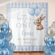 This charming 1st birthday backdrop features a cute bunny holding balloons and a blue gingham background. Designed by Thisisnotme©
