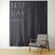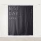 Ce fond de mariage élégant présente un design minimaliste avec la phrase "BEST DAY ever" en typographie moderne et grasse. La mise en page combine des lettres sans-serif robustes avec un script cursif fluide, créant un équilibre entre formalité et sentiment personnel. Sur un fond profond de charbon, la palette de couleurs monochromes renforce l'ambiance sophistiquée et festive, ce qui la rend parfaite pour capturer les moments spéciaux de votre grand jour.