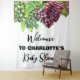 De magnifiques grappes de raisins rouges et verts serrent le bord supérieur de ce mur suspendu qui a des modèles pour votre formulation personnalisée dans une calligraphie et une police de style audacieuse en dessous. Ce design est parfait pour un baby shower dans le vignoble, une célébration dans un vignoble ou pour une exposition ou un spectacle de vin.