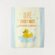 Un canard chanceux ! Premier anniversaire avec canard en caoutchouc et bulles contre un en vichy bleu clair et arrière - plan jaune pâle avec texte orange