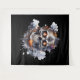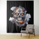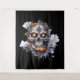 Crânio mágico flamejante com folhas de outono, abóbora e rosa lilás.