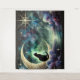 Ce design céleste enchanteur présente un chat noir perché gracieusement sur une lune ornée de croissant doré, entouré d'étoiles chatoyantes et de nuages cosmiques. Des nuances profondes de turquoise, d'indigo et de violet créent une atmosphère nocturne rêveuse, tandis que des détails dorés apportent une touche de magie et d'élégance. La scène mêle mystère et sérénité, évoquant un sentiment d'émerveillement sous le ciel étoilé.