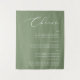 Un menu de boissons en tissu mariage avec "cheers" en couleur calligraphie moderne blanche sur un arrière - plan vert sage.