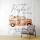 Une tapisserie photo sur le thème de l'automne et un signe de bienvenue pour votre baby shower avec "un petit citrouille sucré est en route" dans un mélange de typographie moderne et un script avec un essaim de coeur, et aquarelles d'un camion vintage en terre cuite transportant des citrouilles orange et crème et des bouquets floraux. Personnalisez le nom et la date de la douche de la mère en simple typographie. Précisez le sexe du bébé si vous le désirez (p. ex., "est en route").