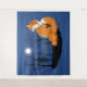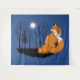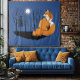 Un renard rouge est assis à côté des citrouilles et des feuilles d'automne. Quelques feuilles d'automne volent vers la forêt derrière le renard