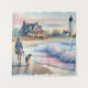 This dreamy coastal artwork captures a tranquil moment at the shoreline, where a woman strolls barefoot with her dog, the soft pastel tones of the setting sun casting a warm glow on the sand and sea. A charming beach house sits nestled among windswept grasses, its porch inviting and timeless, while a stately lighthouse watches over the horizon. Gentle waves roll in with watercolor softness, and hints of blush pink, misty blue, and sun-kissed gold give the scene an ethereal, nostalgic quality. The entire composition evokes slow living, serenity, and the quiet magic of coastal escapes. With a relaxed, coastal cottagecore vibe and a soft, painterly style, this piece blends warmth and whimsy in perfect harmony. AI generated artwork.