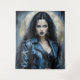 Une femme aux cheveux foncés saisissante aux yeux bleus percevants dégage confiance et mystère, mis en évidence par sa veste de cuir bleu.