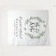 Un élégant fond de tapisserie pour photobooth de mariage avec une couronne aquarelle vert sauge de verdure d'eucalyptus, "M. & Mme" en grande écriture et une illustration de deux cœurs unis. Personnalisez avec vos noms et date de mariage.