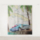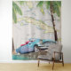 Carte illustrée de Cuba (plus les îles environnantes) dans un beau style vintage et détaillé avec une vieille voiture classique au coucher du soleil.