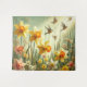 Ceci est une illustration qui montre des jonquilles avec des oiseaux volant. Il a un ton verdâtre.